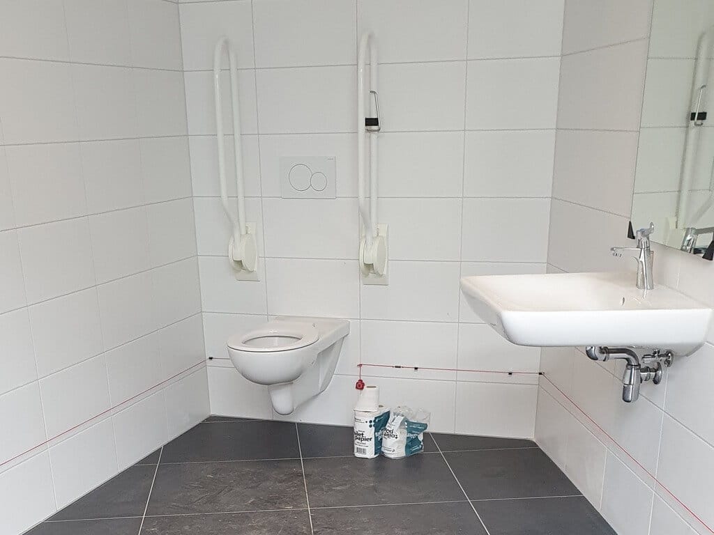 Dit toilet voldoet aan de toegankelijkheidseisen. Het toilet heeft na verplaatsing vuilnisbak, genoeg ruimte om met een rolstoel een transfer te kunnen maken. Er is een alarm aanwezig. Wasbak, zeep en handdoekdispenser op goed hoogte.